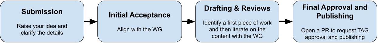 The following process builds on the wider TAG contribution guidelines to provide a lightweight way to ensure that all of these great ideas get the support they deserve within the scope of the WG.